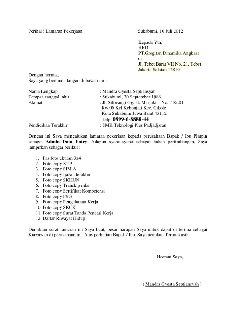 Contoh Surat Lamaran Kerja Sebagai Data Entry